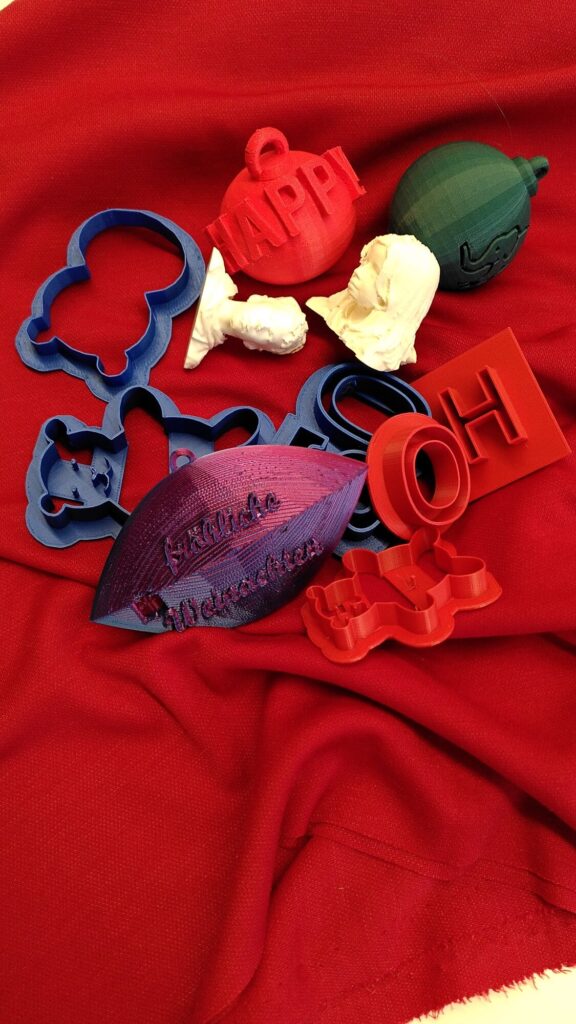 Ihr habt die Möglichkeit, kleine Geschenke oder Deko-Objekte mit dem Lasercutter, 3D-Drucker oder der Stickmaschine herzustellen – zum Beispiel personalisierte Schlüsselanhänger oder Weihnachtsanhänger.
