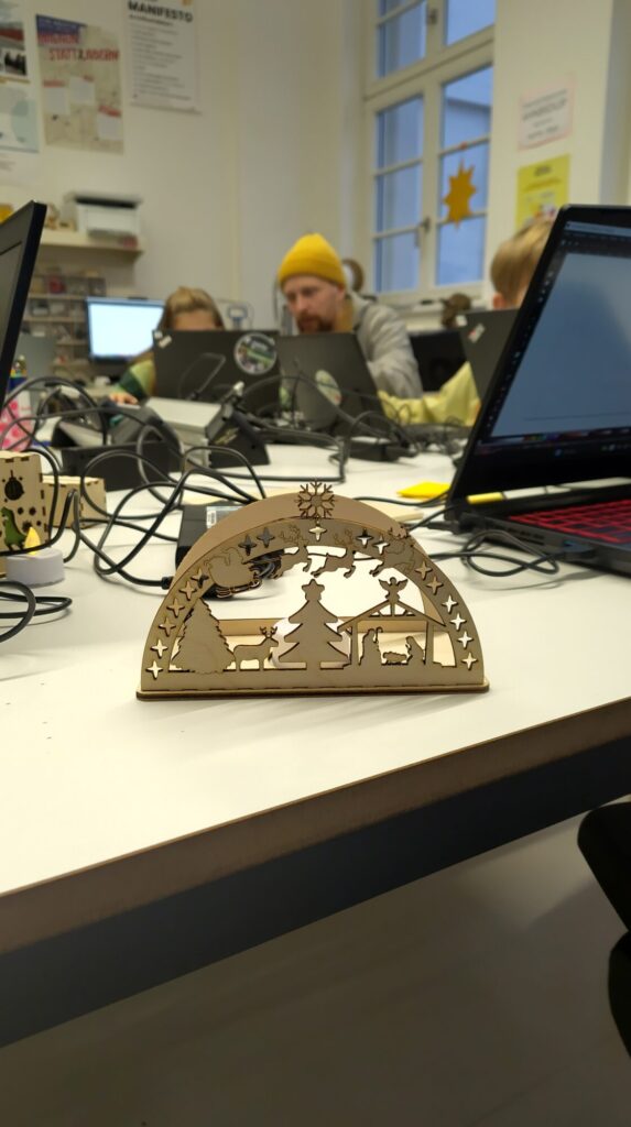 Dort gestalten wir gemeinsam weihnachtliche Motive mit dem Lasercutter – perfekt für kleine Geschenke oder dekorative Anhänger.